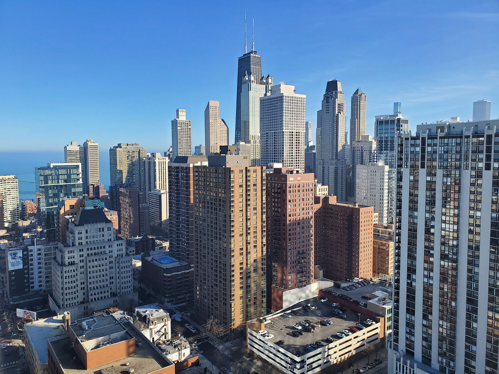 An exceptionally sunny early February afternoon in downtown Chicago. Looking to the southeast, the vibrant blue Lake Michigan glistens in the low angle sunlight. This picture was taken around 2:46pm on February 4.